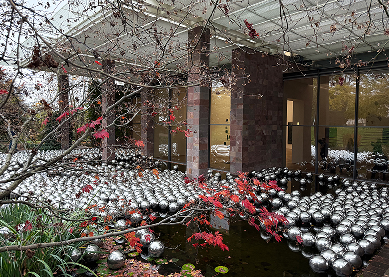 Im Seerosenbecken vor dem Beyeler-Museum sind Kusamas Polka Dots in Form von schwimmenden Kugeln sichtbar. Es sind grosse, verchromte Kugeln, die wie Spiegel wirken und die Umgebung unendlich multiplizieren.