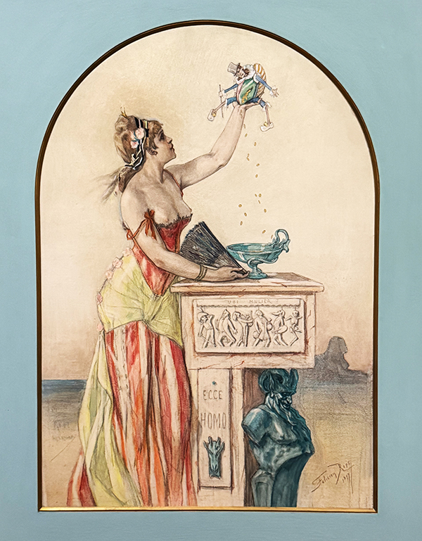 Von diesem Thema malt Rops vier Versionen. In der Version, die in der Ausstellung gezeigt wird, hält die Frau den Hampelmann über einem antiken Altar hoch. Aus seinem aufgeschlitzten Bauch fallen Münzen in das «Opfergefäss» der Frau...