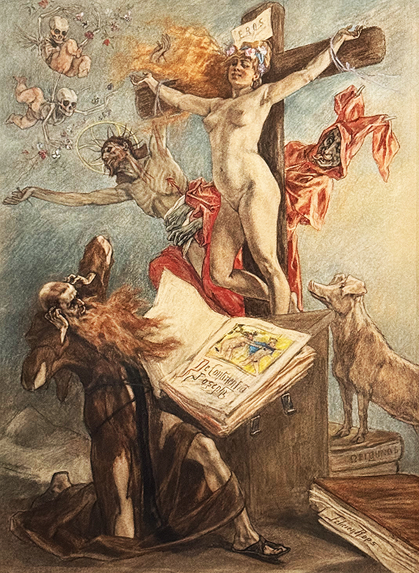 Félicien Rops ist ein Meister der Provokation. Er stellt die Ideale der bürgerlichen Gesellschaft – Frömmigkeit und Anstand – auf den Kopf. In «Versuchung des heiligen Antonius» hängt nicht Christus am Kreuz, sondern eine nackte Frau. Anstelle der christlichen Inschrift INRI am Kreuz heisst diese hier EROS. Damit drückt er aus: Die erotische Begierde verdrängt die christliche Botschaft der Erlösung. Unten links der heilige Antonius, eben noch mit der Lektüre der Bibel beschäftigt, reagiert erschrocken und mit erhobenen Händen auf diese Vision.