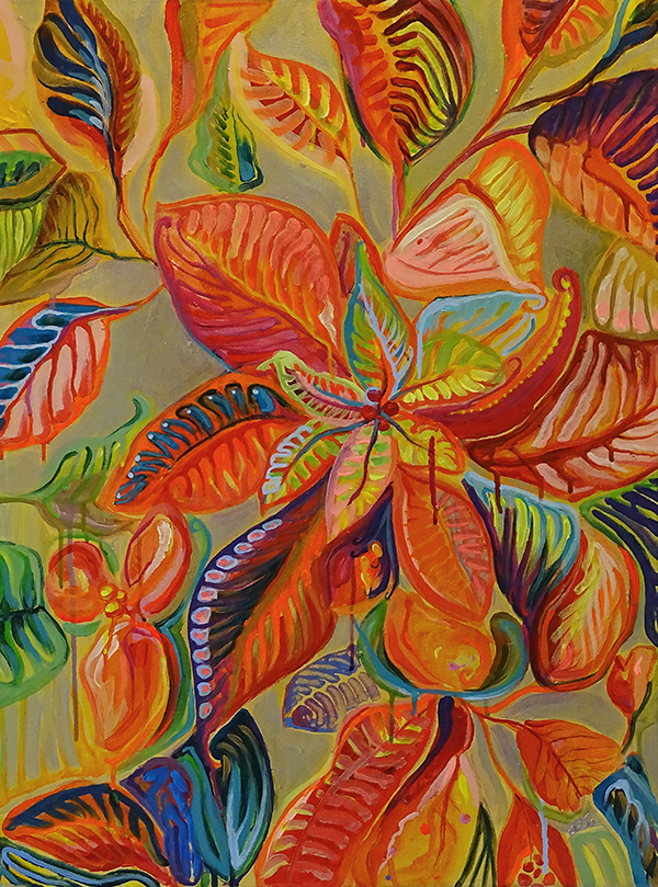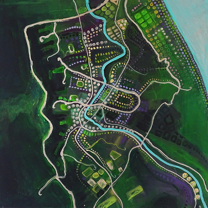 Der Wandlungsprozess beginnt mit einem Werk, das sie mit «Vor der Blüte» betitelt. Dieses relativ dunkle und finstere Gemälde verkörpert gewissermassen die Leere, die in der Kunstpause entstanden ist. Das Folgewerk ist eine malerische Umsetzung ihrer neuen Heimat in Adliswil – in Form einer Landkarte. Im Prozess ist gut erkennbar, wie die Künstlerin und ihre Motive ständig offener werden und die Farben nach und nach heller und leuchtender, auch fröhlicher. Sie passen hervorragend ins Ausstellungsthema «Farb-Emotionen».