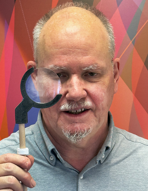 Wer ist der Mann mit dem Prisma-Monokel? Dem Kunstverein gehört er erst seit 2025 an, aber mit seiner faszinierenden Präsentation von autobinären Raumbildern sorgt er hier bereits für Furore. Nicht einfach zu verstehen, was da Mirakulöses mit seinen Bildern passiert, wenn man durch das Prisma guckt. Kein Wunder, fügte Vereinspräsident Walter Diem in seiner Laudatio in der Aussstellung an: «Verstanden habe ich es nicht – aber am besten fragt man den Künstler selbst».