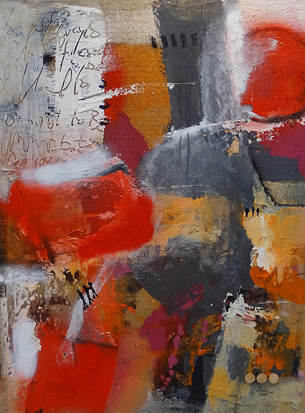 Ihr «Pièce de résistance» in der Ausstellung in Adliswil ist das Werk «40 gefühlte Tage». Auf den ersten Blick erschliesst sich nicht, wo hier Gefühle zu erkennen sein sollen. Erst im Gespräch mit der Künstlerin wird klar, wo in diesem farbstarken Gemälde Emotionen versteckt sein könnten.