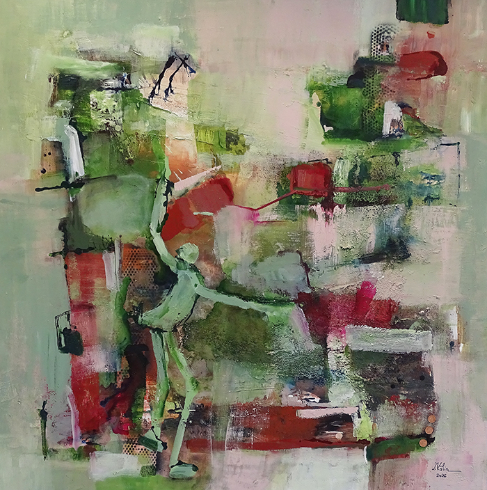 Wer genau hinschaut, erkennt, dass die Künstlerin immer wieder Figuren in ihre abstrakten Werke einbaut. In ihrem Gemälde mit dem Titel «En garde!» taucht da plötzlich ein grünes Männchen auf. Und bei «Nett genäht» sind es sogar drei Figürchen, winzig kleine, schwarze wandernde Gestalten auf einer weissen Fläche. Darauf angesprochen, meint Laura: «Ja, genau. Etwas Figürliches muss bei mir immer rein ins Bild, auch wenn es abstrakte Werke sind. In meinem Herzen bin ich nämlich eine Naturalistin. Die kleinen Figürchen machen mich glücklich».