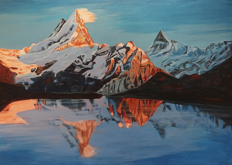 Walter Diem. Schreckhorn und Finsteraarhorn spiegeln sich im Bachalpsee. Acryl auf Leinwand, 140x100cm. |