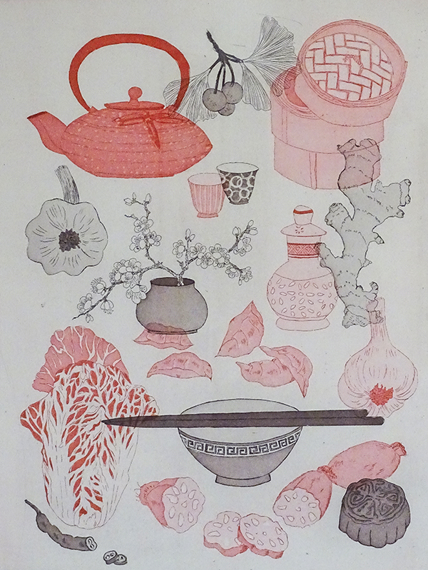 Hauser Susanne Unverkennbar, dass sie einen Hang zur asiatischen Kunst hat. Die Künstlerin zeigt vier Werke mit dem selben Motiv, ab in vier Farbvarianten. Es sind von Hand gedruckte Radierungen auf Büttenpapier, feinste Arbeit.