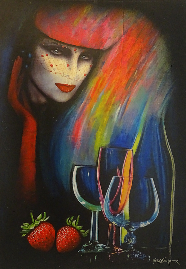 Kostolna Blazenka Ein Porträt als Stilllife? Nein, eine Geschichte. Am unteren Bildrand ein Stillleben mit Gläsern und Erdbeeren. In der Bildmitte der Sturm, der aufziehen wird, wenn die Gäste da sind. Titel des Werks: «Bevor vor die Gäste kommen».