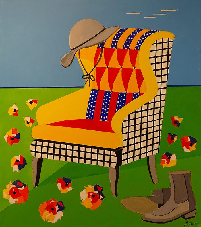Bachmann Therese Mitglied im Verein Kunst-Zürich-Süd seit Früjahr 2025. Sie liebt leuchtende Farben. Da passt dieses popartige Stilllife perfekt. Sie gibt ihm den Titel «Arbeit getan. Tiere im Stall – jetzt setz' ich mich mal».