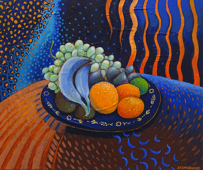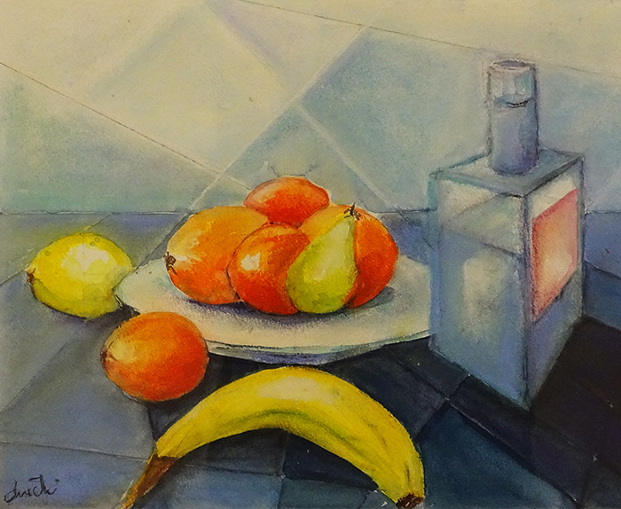 Demoinaux Christel Die in Paris geborene Künstlerin ist seit 2021 Mitglied bei Kunst-Zürich-Süd. In ihrem Stillleben bleibt sie ihren Lieblingsfarben treu: Blau und Orange sind ihr Markenzeichen. Deshalb sind auch ihre Bananen blau.