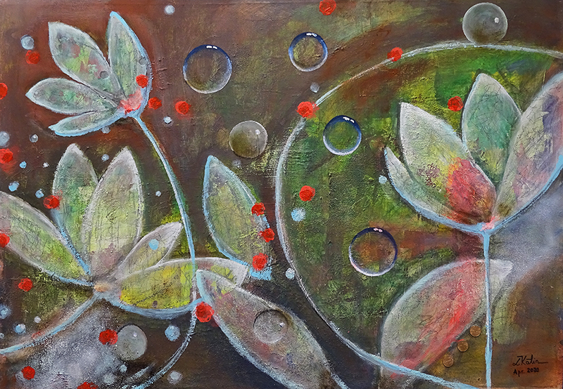 Kälin Laura Ihr Schwerpunkt liegt auf der abstrakt-intuitiven Malerei. Aber für die Stillleben-Ausstellung wird sie ziemlich naturnah. Ein stilisierter Seerosenteich mit grossen April-Regentropfen. |