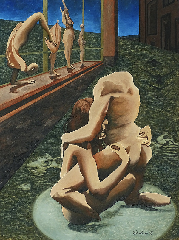 Das ist schade, denn Schweizers Bilder strahlen enorm viel Geheimnisvolles aus. Deshalb würde man gerne mit seinen Gemälden in einen Dialog treten. Da wäre der eine oder andere Hinweis im Titel durchaus förderlich.