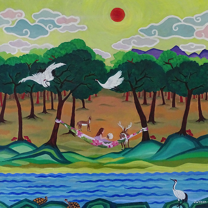 Doch da steckt mehr dahinter. Nämlich koreanische Volkskunst. «Minwha» nennt sie sich. In ihr soll sich der Wunsch nach einem glücklichen, harmonischen Leben manifestieren. Zahlreiche Symbole stehen dafür. Wie Vögel, die eheliches Glück bringen – wenn sie denn als Paar dargestellt werden. Und dann gibt es die zehn Symbole, die für ein langes Leben stehen. Dazu gehören Wasser, Wolken, Sonne, Berge, Felsen, Kraniche, Schildkröten, Hirsche, Kiefern, Pilze und Bambus. In ihrem Ölgemälde «Mädchen und die zehn Symbole» packt Juyeon gleich alle zehn mit rein. Und schlägt damit eine Brücke zu ihrer Heimat Südkorea.