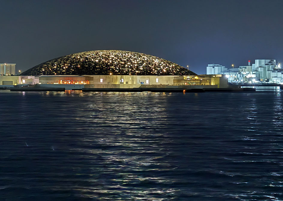 Louvre Abu Dhabi by night – vom Schiff aus gesehen.