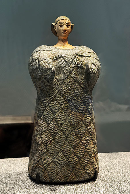 Frau in Wollkleid, eventuell eine Schutzgöttin. Chlorit-Calcit. Baktrien (Persien), 2300-1700 v.Chr.