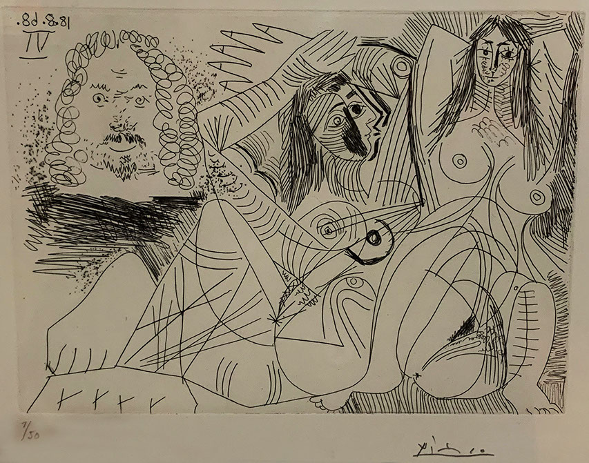 Pablo Picasso (1881-1973). Rembrandtesker Mann und zwei nackte Frauen, 1968. Kunstmuseum St. Gallen.