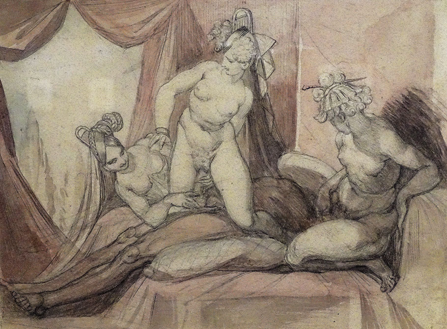 Johann Heinrich Füssli (1741-1825). Erotische Zeichnung, drei Frauen und ein Mann, 1809-10. Victoria & Albert London.