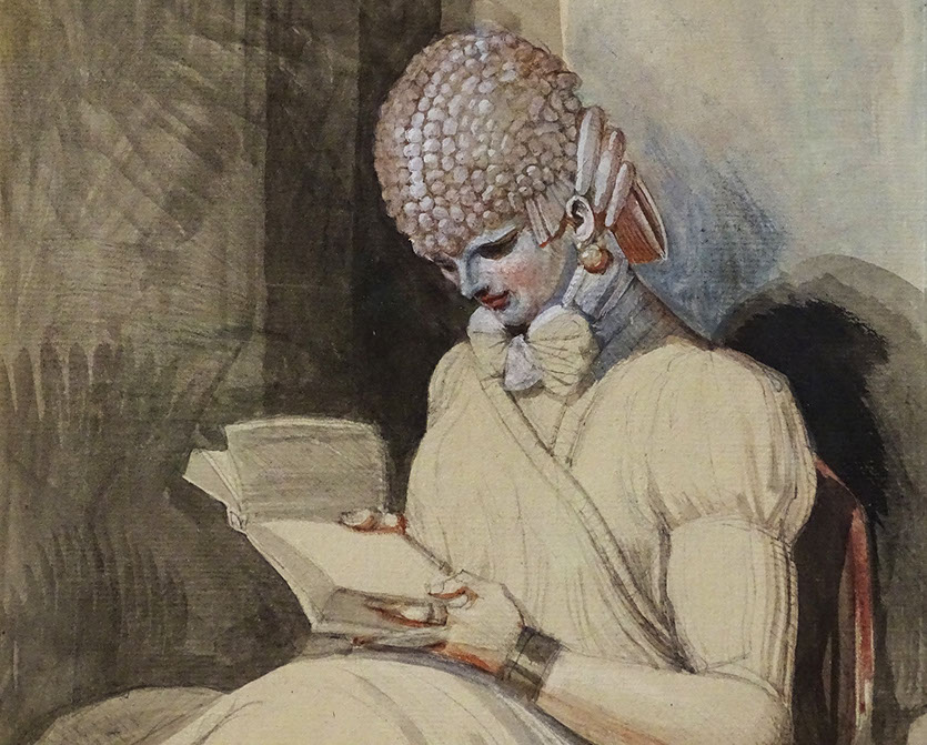 Johann Heinrich Füssli (1741-1825). Lesende Frau (Sophia Füssli?) mit Lockenfrisur, 1796. Detail. Kunsthaus Zürich.