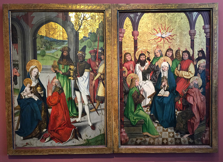 Zürcher Nelkenmeister (Hans Leu der Ältere). Tafeln eines Michael-Altars, um 1495. Anbetung des Christkindes durch die drei heiligen Könige. Pfingsten, Ausgiessung des Heiligen Geistes.