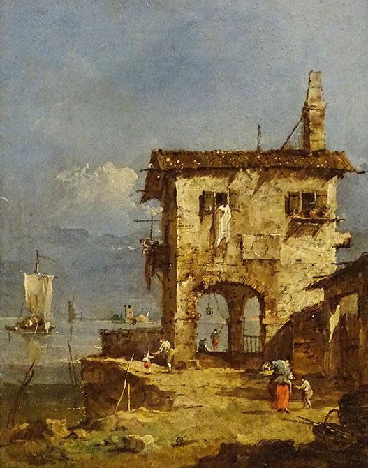 Francesco Guardi (1712-1793). Capriccio con chiesa diroccata, casa rustica e figurine varie in riva alle laguna, 1781.