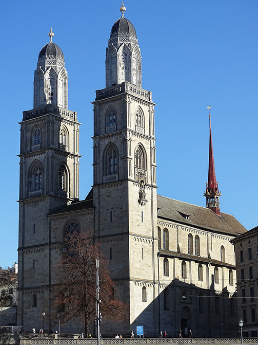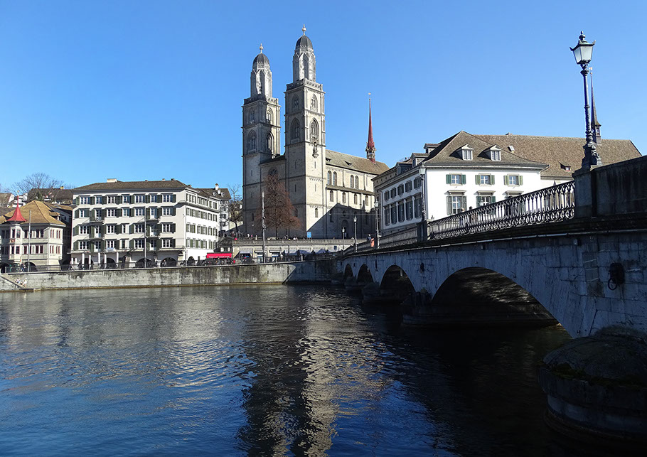 Grossmünster mit Münsterbrücke, von der Limmat aus gesehen.