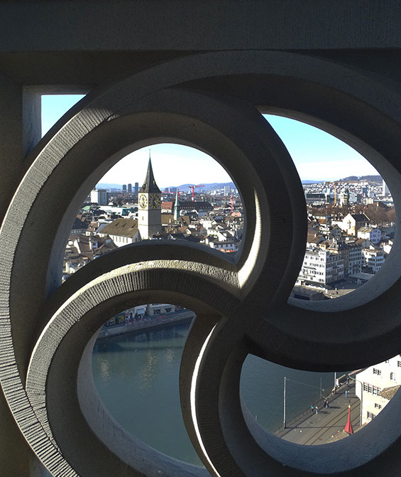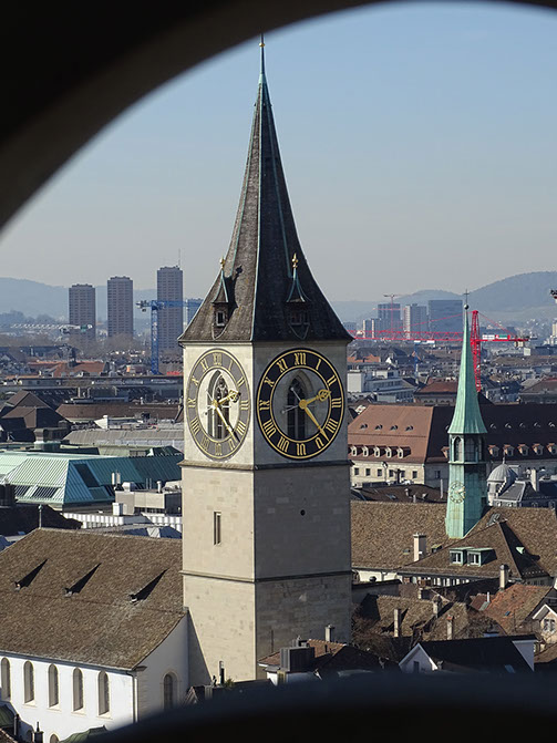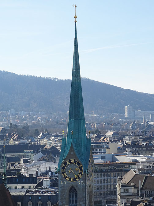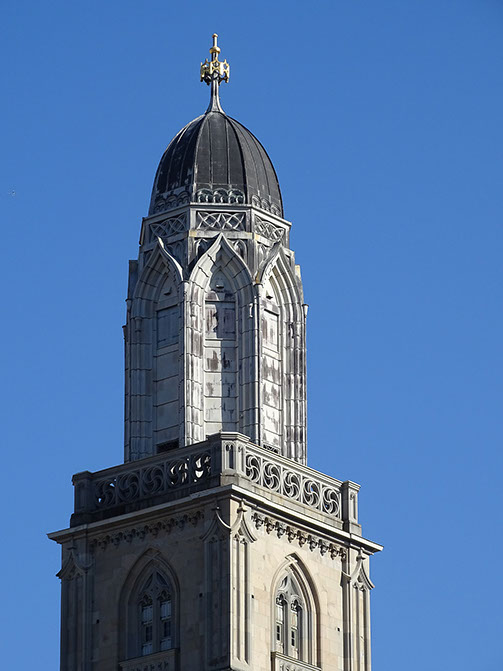 Blick vom Karlsturm auf die Spitze des Fraumünsters.