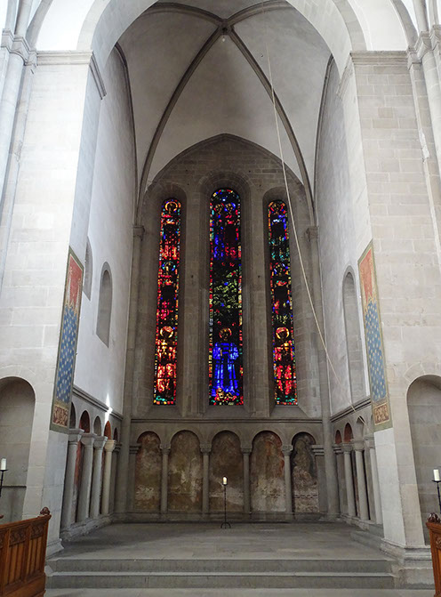 Innenraum, im Hintergrund die Chorfenster von Augusto Giacometti.