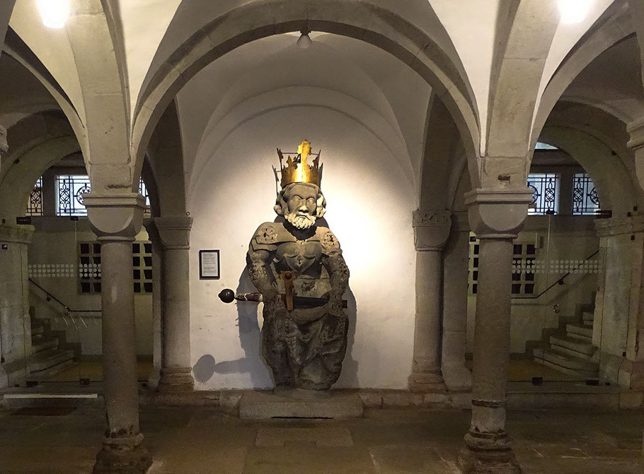 Original-Statue Karls des Grossen in der Krypta. Kopie davon am Südturm von Otto Münch (1885-1965).