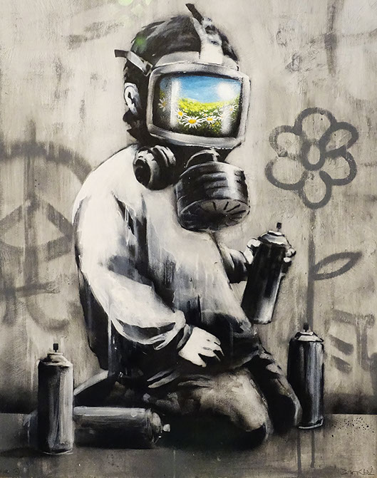 Banksy (1974?). Gasmask Boy, 2009. Private Collection. Moco Museum Amsterdam.