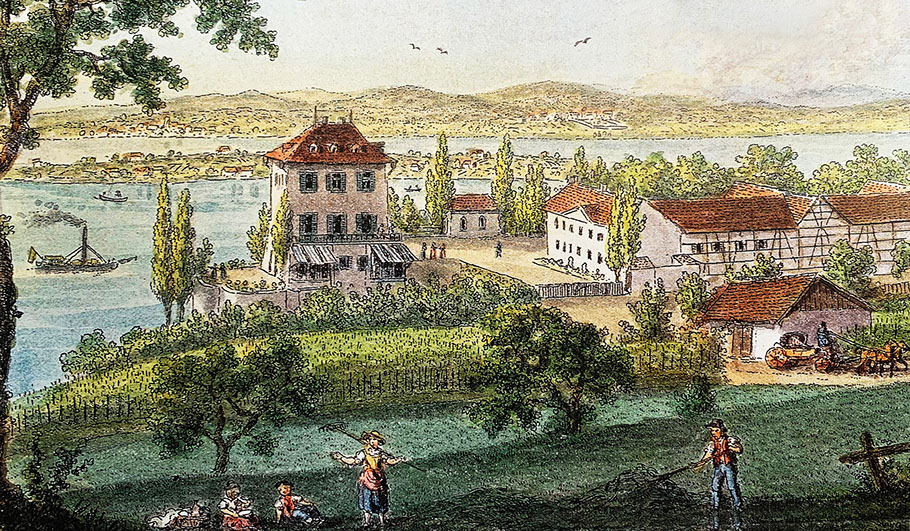 Schloss Arenenberg im Jahr 1825. Villa als Sitz der Königin Hortense, rechts der Prinzenflügel.