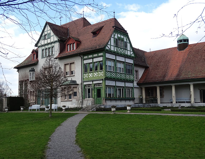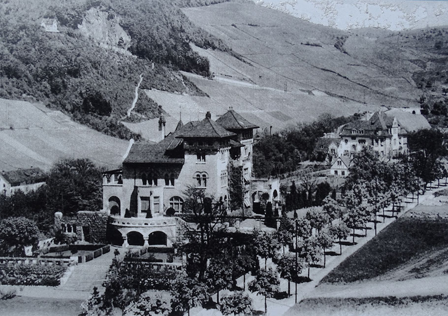 Die 1957 abgerissene Römerburg. Im Hintergrund die Villa Langmatt. Foto von 1902.