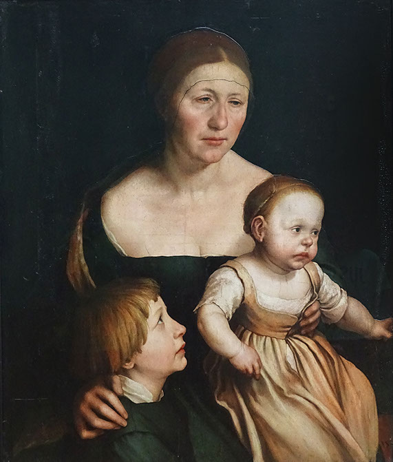 Hans Holbein d.J. (1497-1543). Bildnis der Frau des Künstlers mit den beiden ältesten Kindern, 1528.