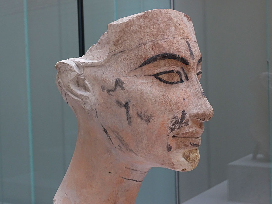 Unvollendeter Kopf der Nofretete mit Korrekturangaben des Bildhauers, ca. 1340 v.Chr.