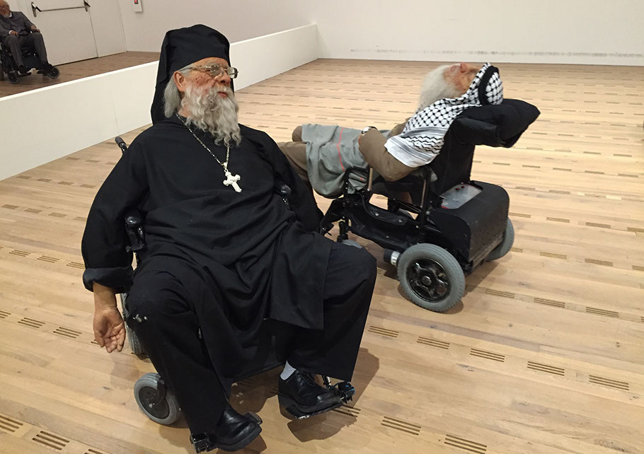 Installation «Old People's Home» von Sun Yuan und Peng Yu. Hilflos im Rollstuhl. Die «Puppen» sind sehr...