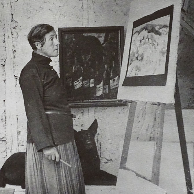 Helen Dahm (1878-1968). Mit Hund Resi vor Staffelei, 1920-30. Foto©Nachlass Regula Witzig, Oetwil am See.