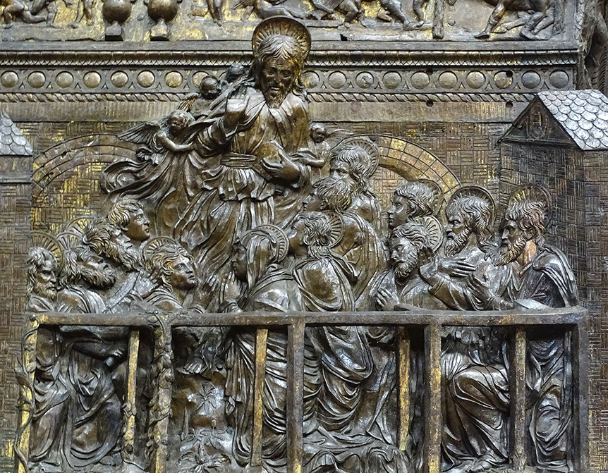 1460-Donatello (1386-1466). Bronzekanzel in der Basilica di San Lorenzo, Florenz. Detail.