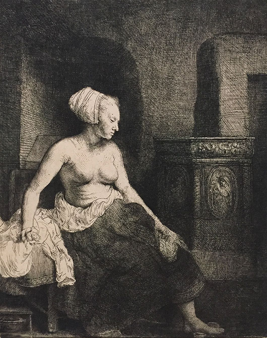 Rembrandt (1606-1669). Halbbekleidete Frau, beim Ofen sitzend, 1658. Radierung.