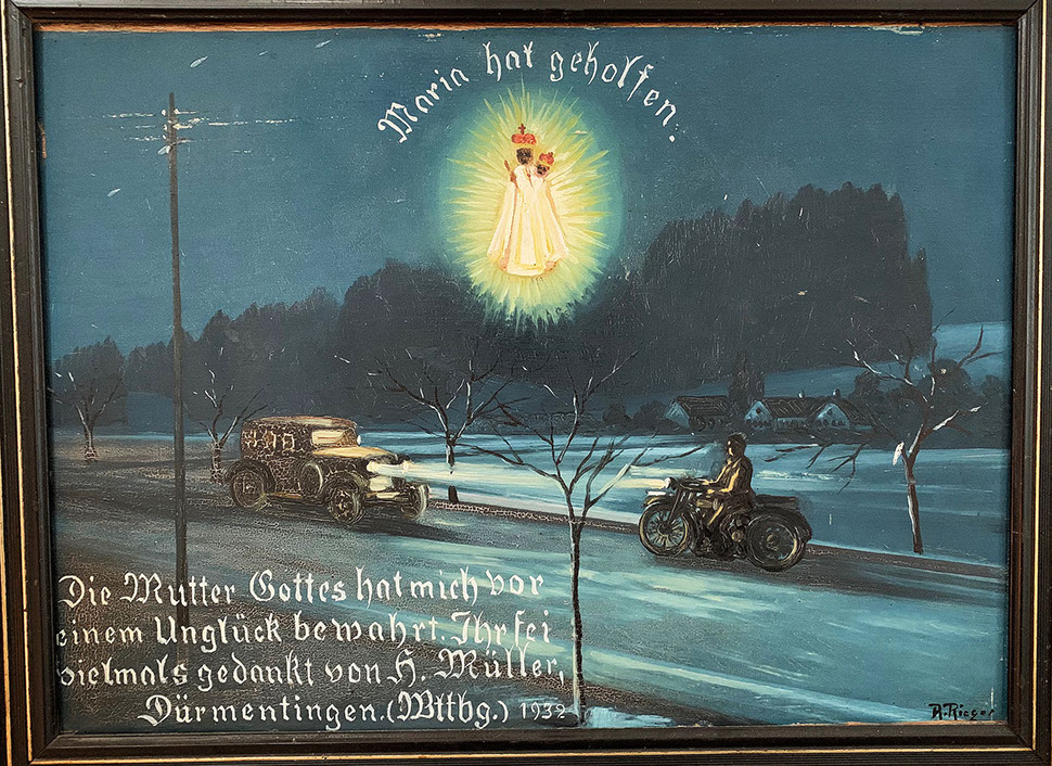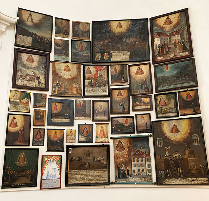 Pinwand mit Fürbitten und Danksagungen an die heilige Jungfrau.