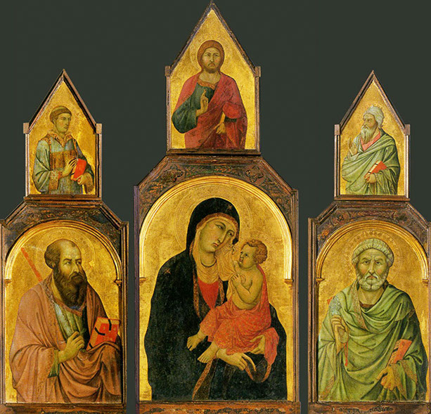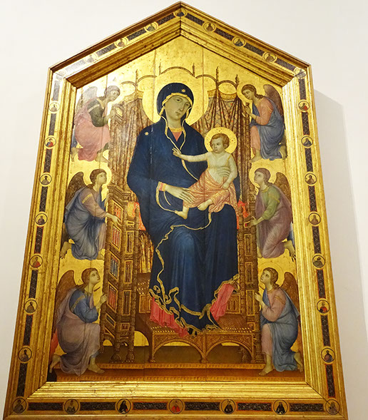 Duccio di Boninsegna (1278-1311). Madonna in trono col Bambino fra angeli, Maesta di Santa Maria Novella, 1285.