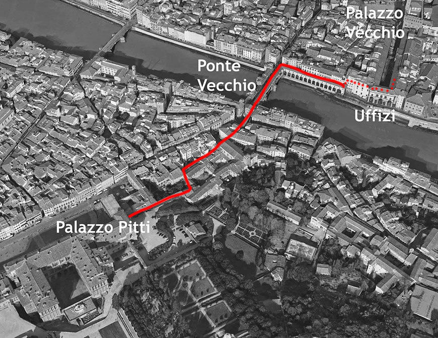 Der Weg des Vasari-Korridors vom Palazzo Pitti zu den Uffizien. Foto Google Earth.