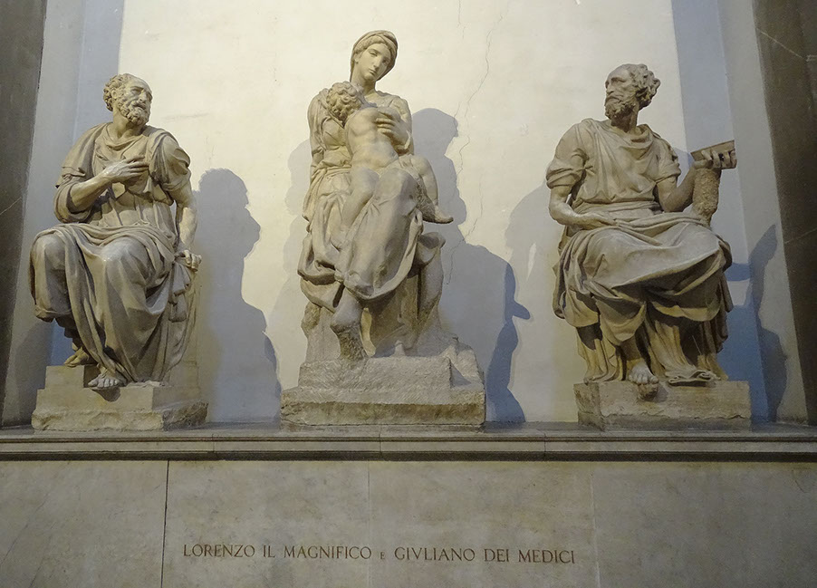 Grabmal von Lorenzo il Magnifico. Hl. Cosmas (Montorsoli), Madonna (Michelangelo), Damian (Montelupo).