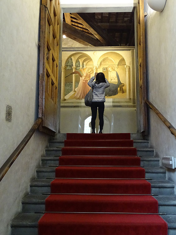 Treppe zum Obergeschoss und ins Dormitorium. Fresko von Fra Angelico, Verkündigung.