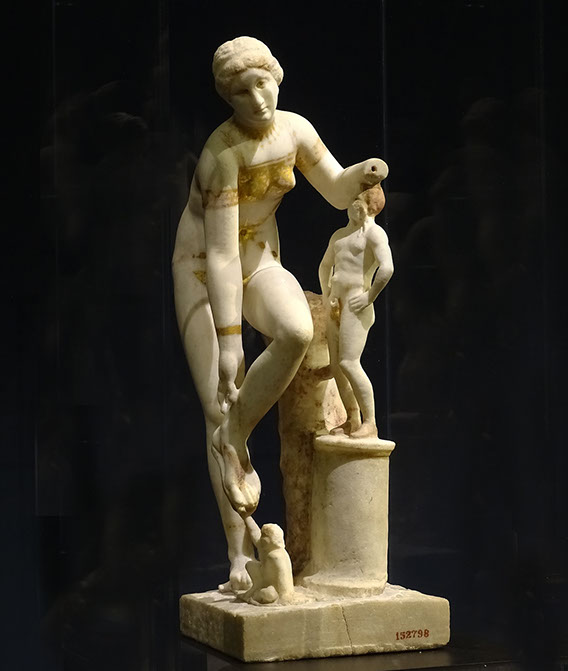 1.Jht v.Chr. Aphrodite (Bikini-Venus) mit Erosknaben. Pompeji, Marmor. Museo Archeologico Nazionale di Napoli.
