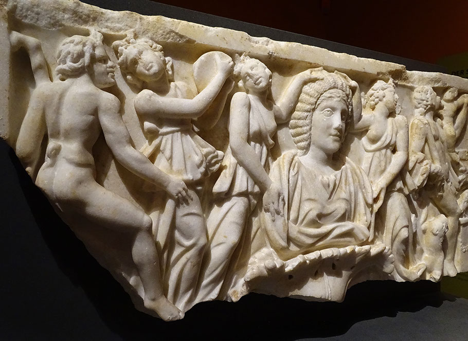 200 n.Chr. Ausgelassener Umzug von Satyrn und Mänaden um das Bild der Verstorbenen. Relief Rom, Marmor.