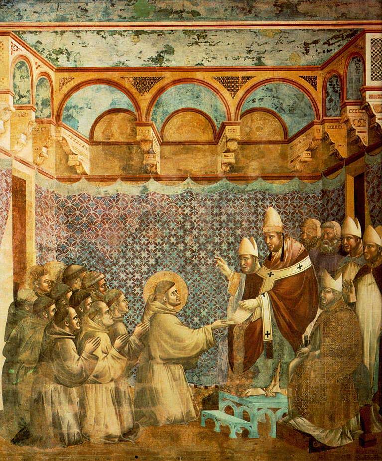 Giotto (1266-1337). Franz bittet beim Papst um die Bestätigung der Regel. Kirche San Francesco, Assisi.