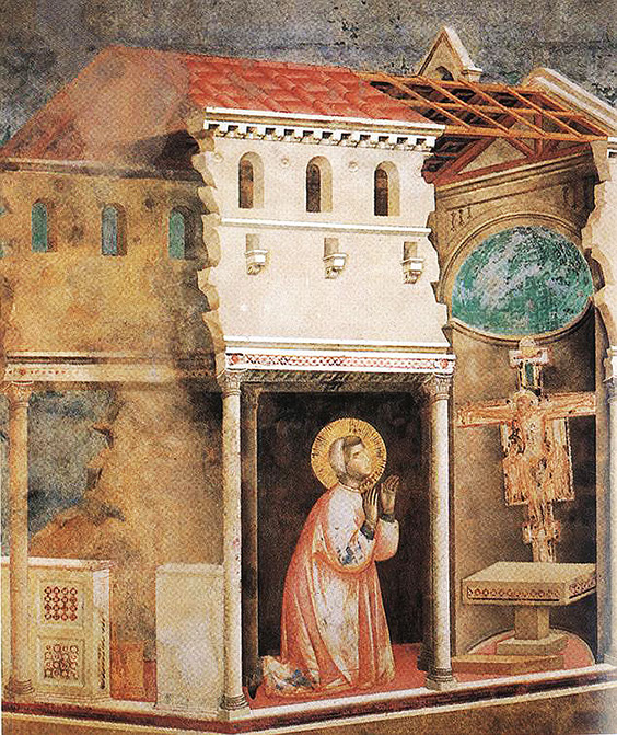 Giotto (1266-1337). Franziskus wird vom Kreuz angesprochen. Obere Kirche San Francesco, Assisi.