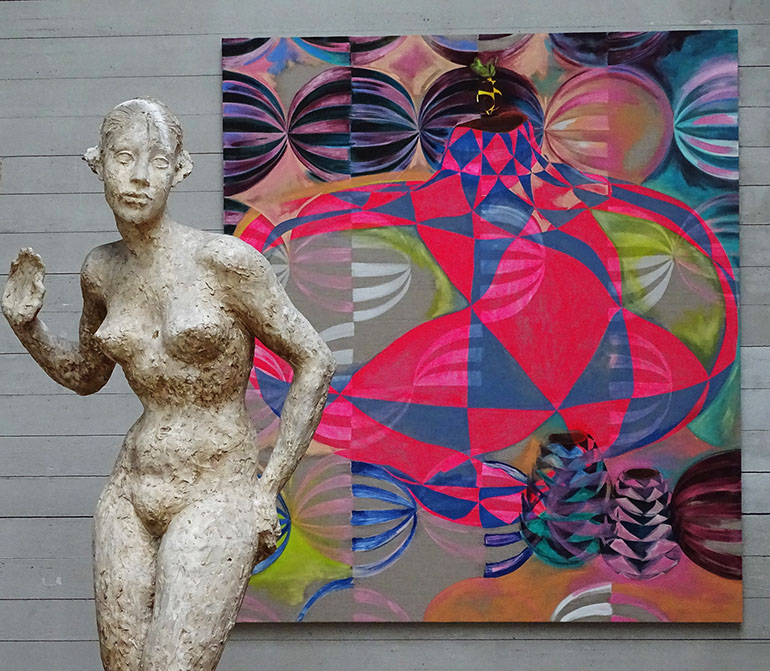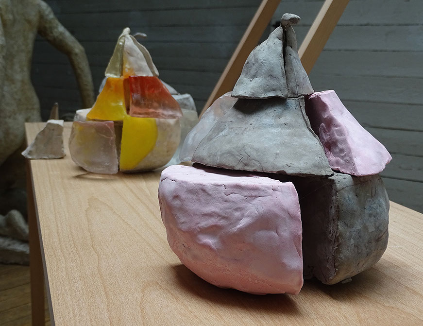 Athene Galiciadis (1978). Gemälde Drei Gefässe und eine Zitrone, 2020. Skulptur Hermann Haller.