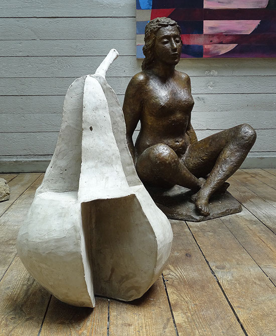 Athene Galiciadis (1978). Gemälde Stillleben (Drei Bananen und zwei Gefässe), 2020. Skulptur Hermann Haller.