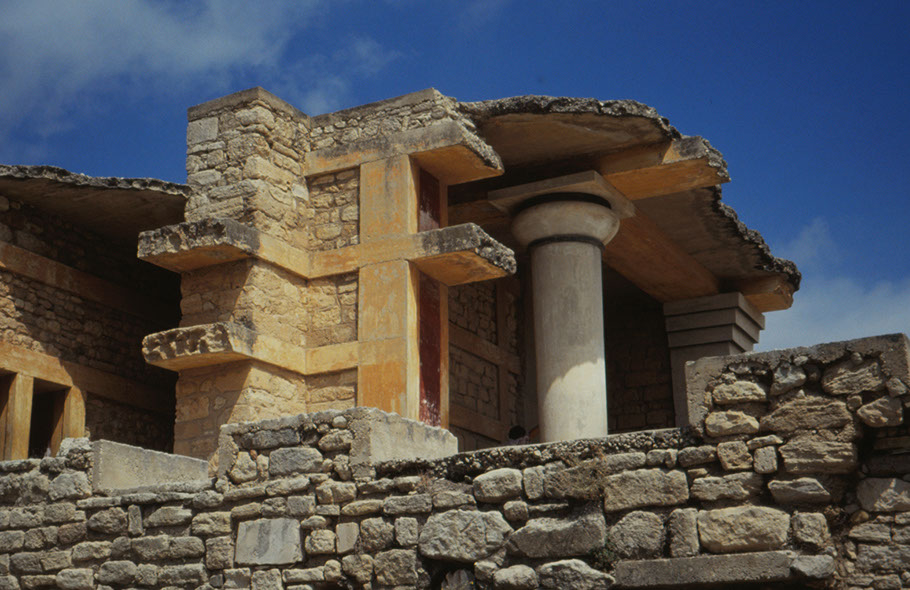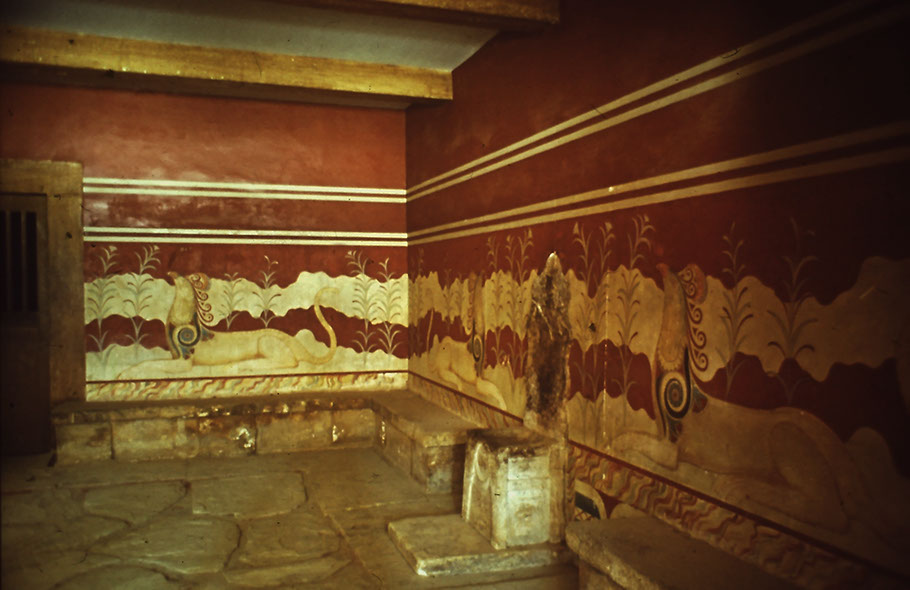 Alabaster-Thron des mystischen Königs Minos. Fabelwesen bewachen den (für einen König relativ kleinen Raum).