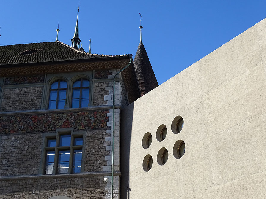 Von der Limmat aus gesehen. Der moderne Beton-Anbau verdeckt einen grossen Teil des alten Museums.