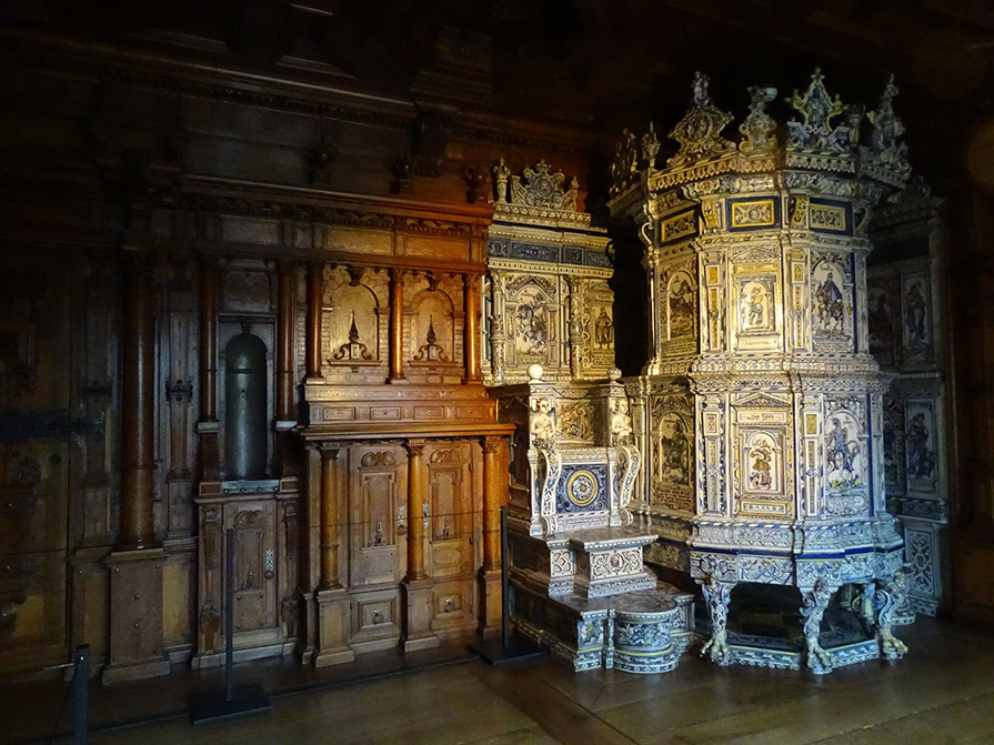 Zimmer des alten Seidenhofes um 1620. Mit Kachelofen und einer thronartigen Ofenbank.