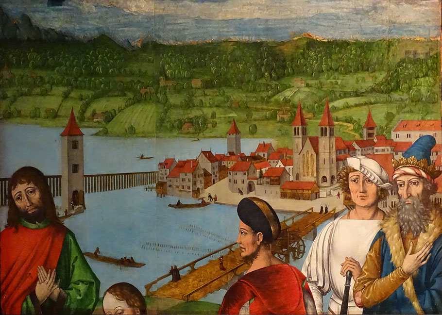 Älteste Ansicht von Zürich. Altargemälde von Hans Leu d. Ä., 1497-1502. Martyrium der Stadtheiligen Felix und Regula.